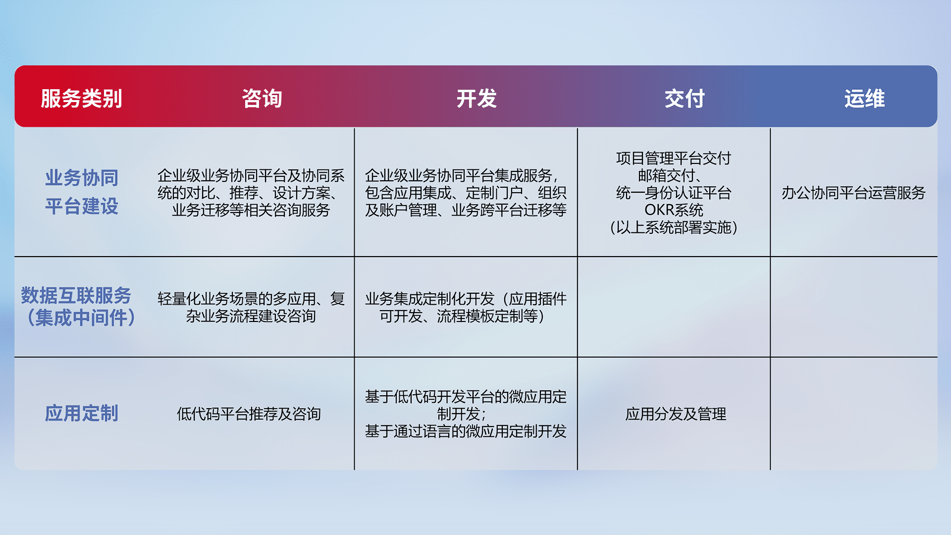 针对钉钉、、、企微、、、IDaas等平台级产品提供产品的规划、、、、方案、、、交付、、定制化开发等服务,,,,实现如统一协同办公、、智能客户服务、、、混合会议管理、、、智能数据查询、、、等业务场景,,,,实现数字化转型。。。。